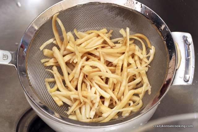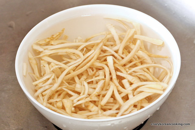 2. Soak dorajiSoak 35g of dried doraji (platycodon roots) in water for at least 3 hours. Overnight is ideal! Then soak in salt water for 20 min to get rid of the bitter taste (salt water step is optional). |
