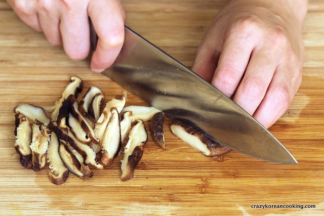 3. Soak and wash mushroomsSoak dried shiitake mushrooms in sugar water (1 tbs sugar + 2 cups water) for 30 min or until they become soft. Then, wash thoroughly and squeeze all the water out. If you can get fresh Shiitake mushrooms, just wash them in cold water. |