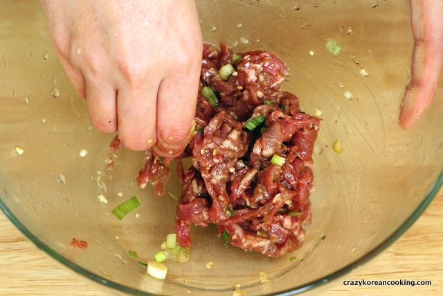 9. Prepare beefJulienne 100g of beef and marinate with 1 teaspoon of regular soy sauce, ½ teaspoon of sugar, ½ teaspoon minced garlic, 1 teaspoon of sesame oil, 1 teaspoon chopped green onions, ½ teaspoon of sesame seeds and a pinch of black pepper. |