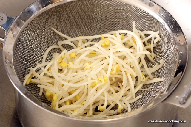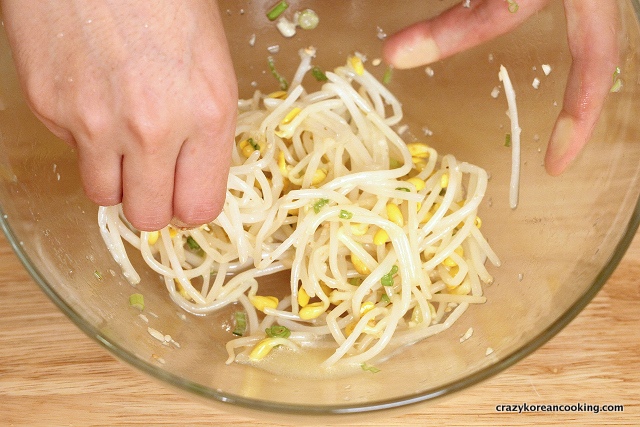 20. Season soy bean sprouts and mixSeason soy bean sprouts with the following and mix well with your hand: ¼-½ teaspoon of salt, ½ teaspoon of minced garlic, ½ teaspoon of sesame oil, 1 teaspoon of green onions, a pinch of black pepper and ½ teaspoon of sesame seeds. |