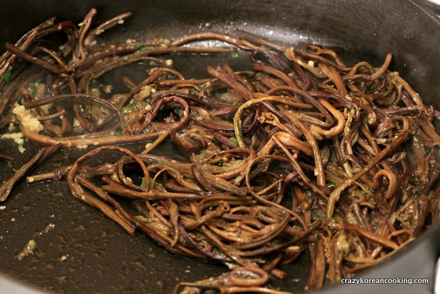 12. Sauté gosariCoat a pan with 1 teaspoon of sesame oil. Sauté gosari (fernbrake) with ½ teaspoon of minced garlic, for 3 min on medium heat. Add 2 tablespoons of water, 1 tablespoon of gukganjang (soy sauce for soup), 1 teaspoon chopped green onions and saute for another 5-10 min until softened. If it starts to stick to the bottom, you can add a bit more water. Turn off the heat. Add a pinch of black pepper and ½ teaspoon of sesame seeds. *Cooking time may differ depending on how the gosari was dried and how long the gosari was soaked in water. |