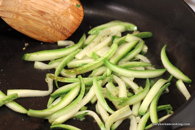 16. Sauté zucchiniSauté zucchini with 1 teaspoon of sesame oil, ¼ teaspoon of salt, ½ teaspoon of minced garlic, 1 teaspoon of chopped green onions, a pinch of black pepper and ½ teaspoon of sesame seeds on medium heat for 3 min or until cooked. |