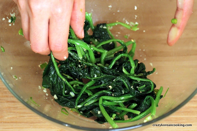 18. Season spinach and mixSeason blanched spinach with the following and mix well with your hand: ⅛-¼ teaspoon of salt, ¼ teaspoon of gukganjang (soy sauce for soup), ½ teaspoon of minced garlic, ½ teaspoon of sesame oil, 1 teaspoon of chopped green onions, a pinch of black pepper and ½ teaspoon of sesame seeds. |