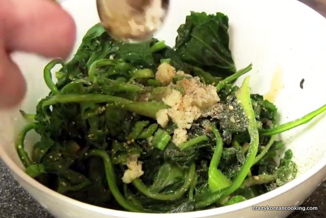 19. Season spring greens and mixSeason bom namul (spring greens) and mix exactly same way as spinach: ⅛-¼ teaspoon of salt, ¼ teaspoon of gukganjang (soy sauce for soup), ½ teaspoon of minced garlic, ½ teaspoon of sesame oil, 1 teaspoon of chopped green onions, a pinch of black pepper and ½ teaspoon of sesame seeds. |
