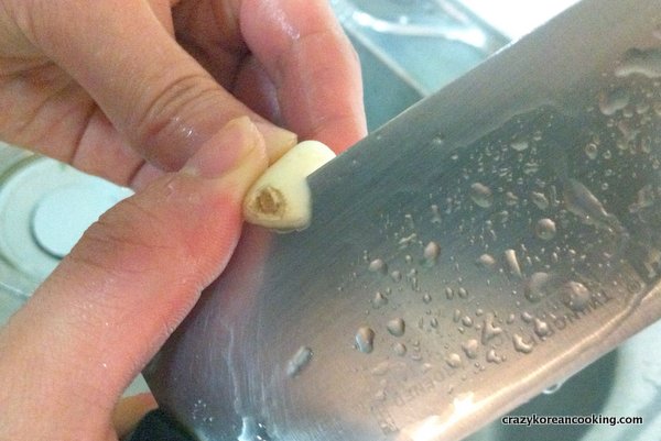 Break garlic bulbs into cloves and peel each clove. Cut off the root.