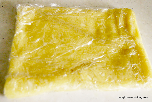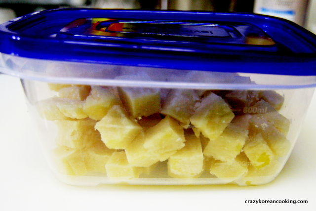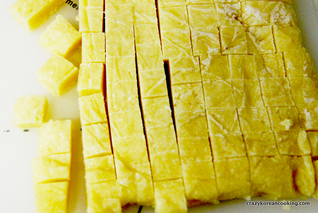 Take it out of the freezer and leave it in room temperature for about 30 seconds or until it is just soft enough to cut. (Don’t leave it out too long. Once it becomes too soft it won’t cut nicely.) Cut the frozen minced garlic into cubes (1cm x 1cm x 1cm).