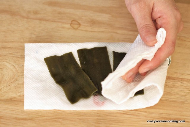 2. Soak & wash dasimaSoak 4 pieces of dried kelp (2” X 2” or equivalent portion) in water for 30 minutes. Rinse and pat-dry with paper towel or clean kitchen towel. |