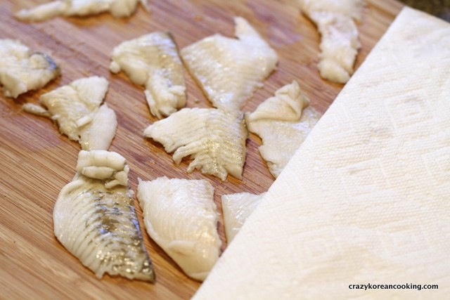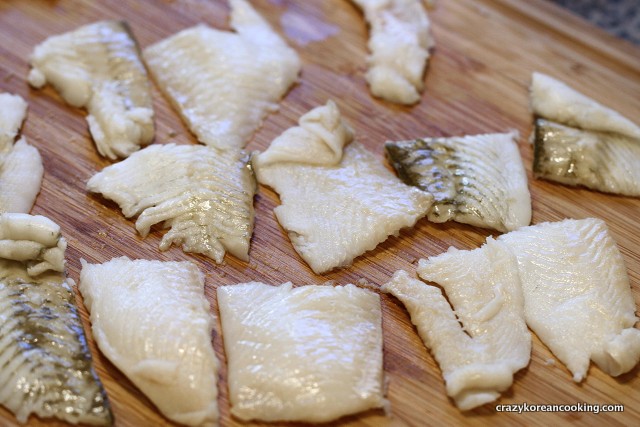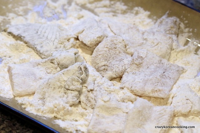 19. Prepare pollockCut pollock fillet into a large bite sized pieces. Wipe any moisture using paper towel or kitchen towel. |