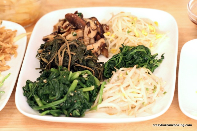 4. Prepare namul (optional)Prepare 2 to 5 namul’s you like such as gosari (fernbrake) namul, spinach namul, soybean sprouts namul, gaji (egg plant) namul, etc. See all namul recipes here. You can also see classic bibimbap recipe to learn how to make various namul toppings. |