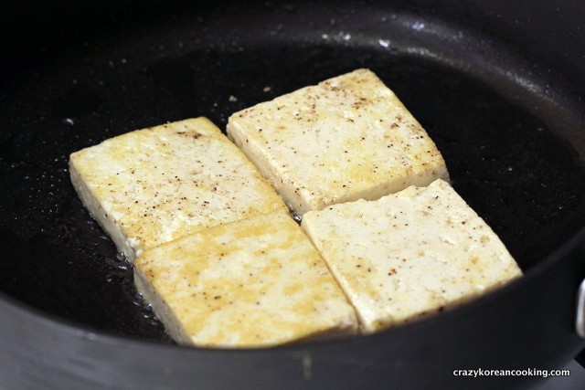 7. Pan-fry tofuLightly coat a non-stick pan with vegetable oil. Pre-heat on medium heat for a minute. Cook both sides of the tofu pieces until golden. *Don’t preheat too long. The oil might splash when you add tofu to the pan. |