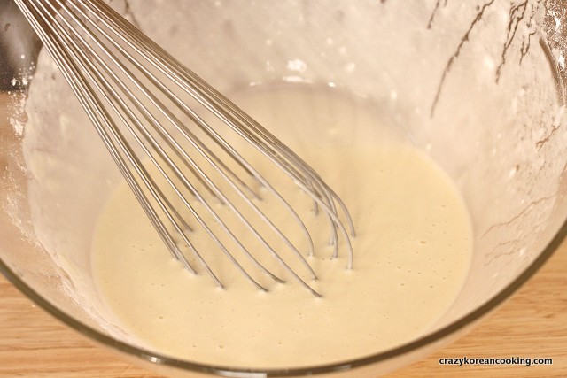 12. Make jeon batterMake jeon batter by mixing 1 cup of buchimgaru (Korean pancake mix) & 1 cup of cold water. You can use wheat flour or rice flour instead of buchimgaru. But buchimgaru gives more flavor and crispier texture. |