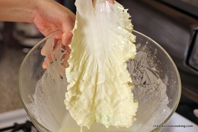 14. Coat napa cabbage with batterDip a leaf of napa cabbage in the batter and place it in the pan. |