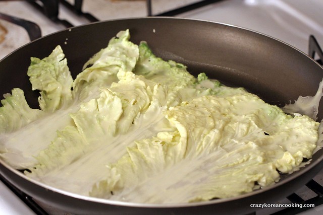 16. FlipFlip the nappa cabbage leaves and cook until the bottom is golden for about 2-4 minutes. Set it aside on paper towel or a strainer to drain fat. |