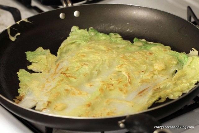 15. Pan-fryCoat the rest of nappa cabbage leaves with the batter and add to the pan, allowing the leaves to overlap. Do this quickly. Once the batter is cooked they won’t sick together. Let it cook on medium to hight heat until the bottom is golden for about 2-4 minutes. |
