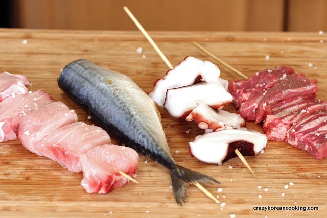 23. Prepare fish and beefCut the shark fillet, octopus and beef into roughly 2” X 1” pieces. Thread each kind onto a skewer (optional). |