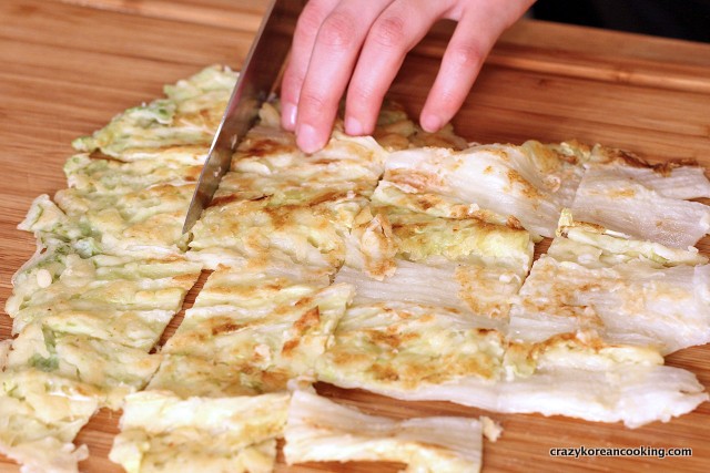 26. Cut napa cabbage jeonOnce the napa cabbage jeon is cooled, cut it into roughly 2” X`1” pieces. |