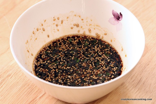 27. Make sauceIn a bowl, mix 6 tablespoons of soy sauce, 3 spoons of water, 2 teaspoons of sesame oil, 1 teaspoon of minced garlic, 2 tablespoons of chopped green onions and 1 teaspoon of sesame seeds (optional). Place the sauce into 4 small sauce bowls to serve with 4 bibimbap at the end. |