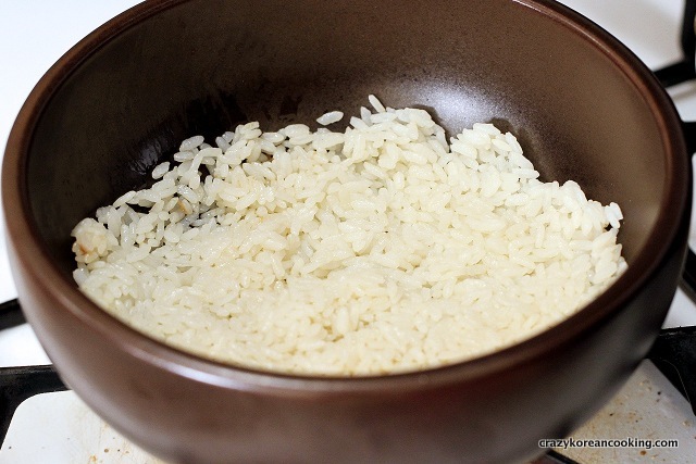 Coat stone bowl with oil Place a bed of rice Low Heat (golden brown crust) | |