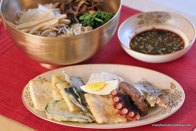 In general, Andong bibimbap includes three categories of toppings: vegetable namuls, steamed fish or meat and jeon (coated & pan-fried. To simplify this dish, you can just pick a couple of vegetables namuls and one from each of the steamed and jeon categories.
