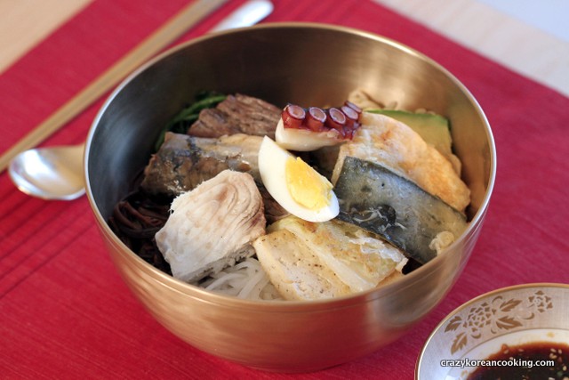 Andong Bibimbap is originated from Andong in the province of Kyeong-sang-buk-do. It features delicious vegetable namul's, steamed fish and a variety of jeon (coated and pan-fired fish and vegetables). Unlike other bibimbap, it’s served with soy sauce instead of spicy gochujang sauce. Traditionally, vegetables namul's are served on top of rice in a large brass bowl and the rest is served on a bronze plate. But, you can also arrange all toppings in a bowl like other bibimbap.
