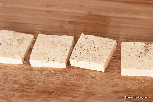 6. Cut tofuRinse about ½ tofu block (about 200g) under running water. Pat-dry with paper towel or kitchen towel. Cut tofu into ¾” (or 1 cm) thick rectangles. |