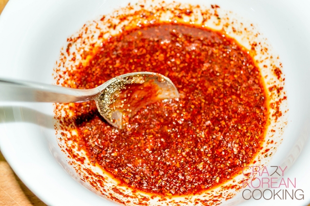 1. Make seasoning sauceIn a bowl, put 1 tbs of gochujang (hot pepper paste), 3 tbs of gochugaru (hot pepper flakes), 1 tbs of sugar, 1 tbs of anchovy fish sauce, 3 tbs of rice wine, 1 tsp of soy sauce, 1 tbs of minced garlic and ½ tsp of black pepper. Mix well and set it aside. Let it mature for about 30 min. (If you have time, mature the sauce overnight.) |