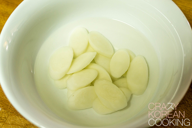 2. Soak rice cake (optional)Soak rice cake in cold water for about 30 minutes (optional). *This is optional, but pre-soaking will reduce the cooking time and make the broth less starchy. If you like starchy broth, don’t pre-soak and add rice cake at the beginning. |
