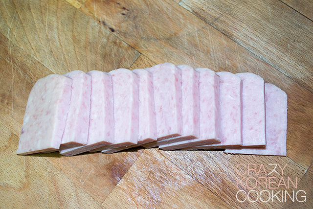 3. Cut spamCut 5.3 oz (150g) of spam into thin two bite-size pieces (approximately 1.5” x 1.5” x ¼” or 4 cm x 4 cm X 0.6 cm). |