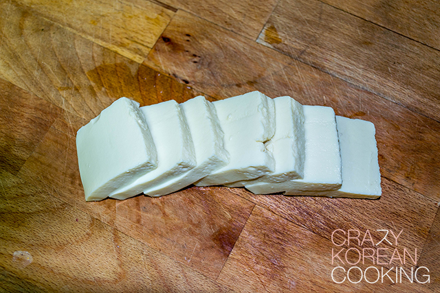 4. Cut TofuCut 6 oz (170g) of tofu into two bite-size pieces. Don’t cut it too thinly. It may break. (approximately 1.5” x 1.5” x 3/8” or 4 cm x 4 cm X 0.9 cm). |