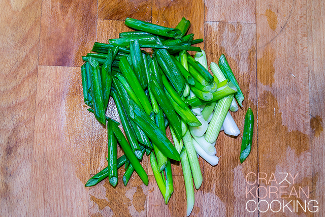 8. Cut green onionsWash, peel and cut 5 green onions diagonally. |