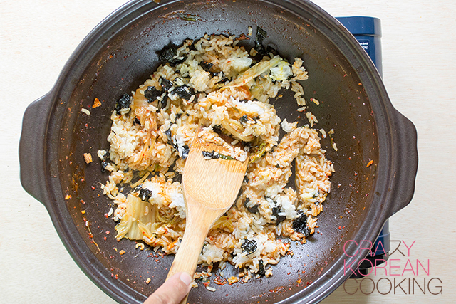 13. Fried Rice I (Optional second course)After finishing the soup, remove the liquid from the pot leaving a very small amount of broth at the bottom. Add the rice mix (cooked rice, chopped kimchi, crumbled seaweed sheets, cracked egg and sesame oil) into the pot and stir-fry on high heat for 3 min. |