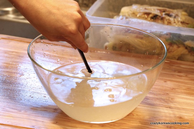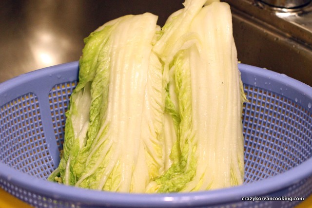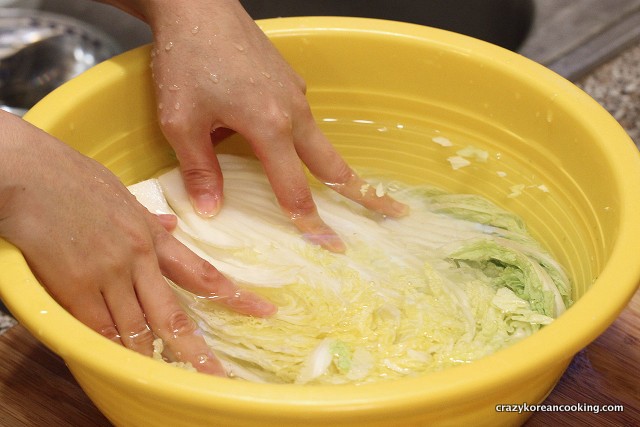 3. Combination of dry and wet methods: Make salt solution (water: coarse salt=5:1) in a large enough bowl to fit a half napa cabbage. Dip each half in the solution, take it out and place it in a large empty bowl. Then, sprinkle about ¼ cup of coarse salt (for each half) between the layers only on the white stem part. Repeat for each half. Then, pour the salt solution in the large bowl with all the napa cabbage halves. Leave them for about 3-4 hours. Flip the cabbages and leave it for another 3-4 hours (total 6-8 hours).