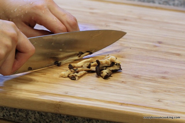 5. Soak shiitake mushroomsMix 2 cups of water and 1 tablespoon of sugar (Sugar is optional. It just helps speed up the soaking process. Soak 1 oz (4 to 5) of dried shiitake mushrooms in the mix for about 30 min or until soft. Shiitake mushrooms are optional. |