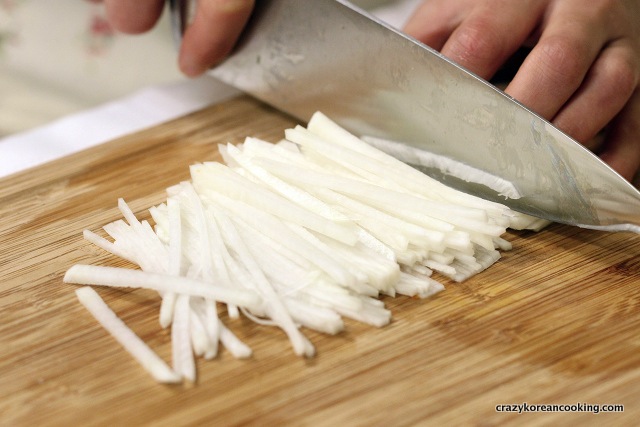 7. Julienne radishPeel, wash and finely julienne 100g of Korean radish (about ⅕ - ¼ of Korean radish depending on the size). |