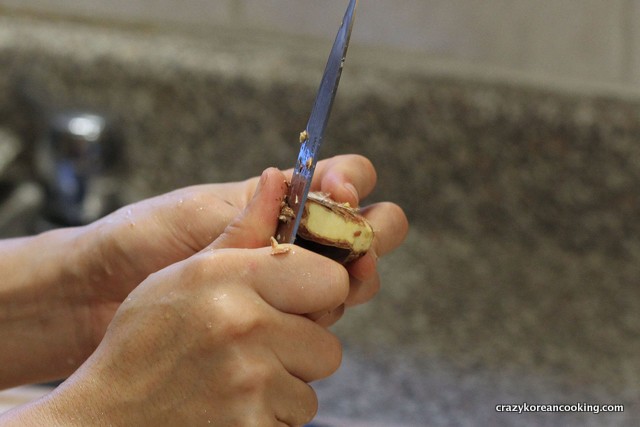 10. Peel chestnutPeel 2 oz (about 6) of chestnuts. You can buy pre-peeled chestnuts but they should be uncooked for an authentic Korean style baek kimchi. |