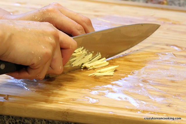 8. Julienne garlic & gingerPeel, wash and julienne 3 cloves of garlic and ½ oz of ginger. |
