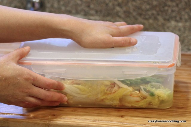 Remember that kimchi will produce gas and liquid as it is fermented. Leave some room in the container, or it will overflow.