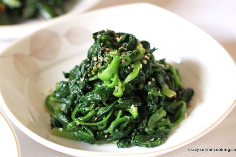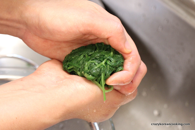 4. SeasonSeason spinach with ¼ tsp salt, ¼ tsp gukganjang (soy sauce for soup), 1 tsp sesame oil, 1 tsp minced garlic, 2 tsp chopped green onion and ½ tsp sesame seeds. Mix well by hand. |