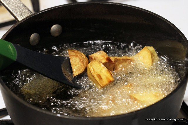 3. FryPour 4 cups of vegetable oil into a pot. Preheat oil to 180°C/350°F. Deep-fry the sweet potatoes in preheated oil until they turn golden brown (or until a fork or a chopstick is easily poked into the sweet potatoes). |