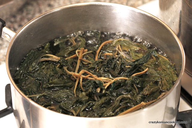 2. BlanchBoil 4 cups of water on high heat. Blanch chwinamul in boiling water with a pinch of salt until soft (15-30 min depending on how long the chwinamul was soaked). *For fresh ones, blanch quickly (1 min) until it’s wilted. |