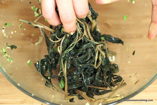 5. SeasonSeason chwinamul with ⅛ - ¼ teaspoon of salt, ¼ teaspoon of gukganjang (soy sauce for soup), 1 teaspoon of sesame oil, ½ teaspoon of minced garlic, 1 tablespoon of chopped green onions and 1 teaspoon of sesame seeds. Mix well by hand. *The amount of salt may vary depending on the type or brand of the salt. |