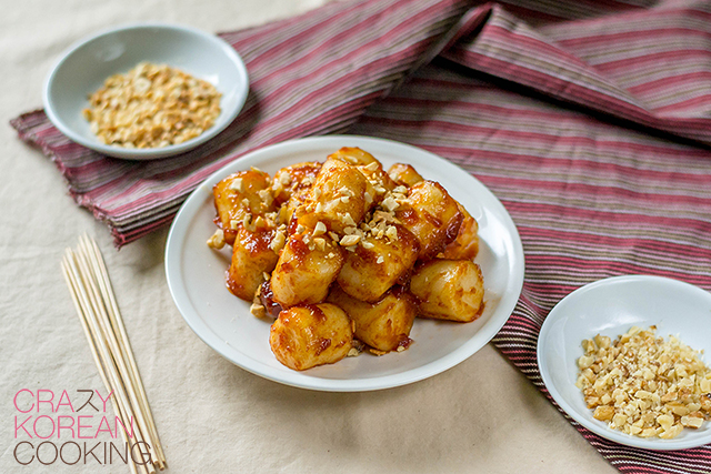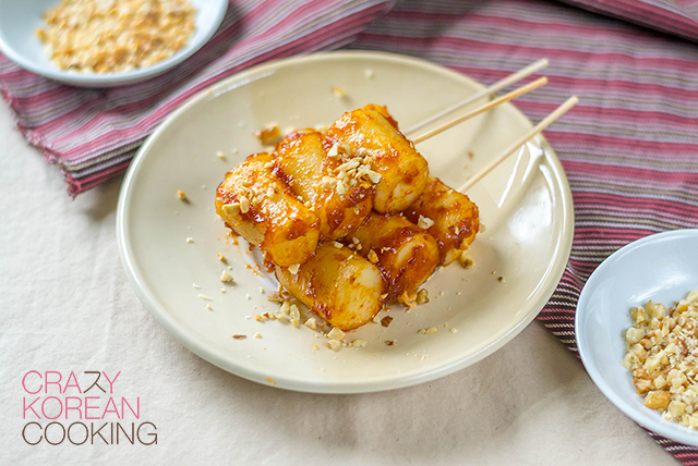 Ddeok gangjeong is often topped with chopped peanuts for an added crunch. It's a quick dish that takes less than half an hour and makes a perfect accompaniment for cocktails (anjoo), a simple dinner, or appetizer. For festive hors d'oeuvres, try putting them on skewers. Make sure to serve them warm or right out of the pan; the rice cakes will harden as they cool.