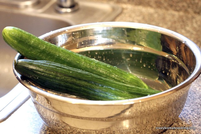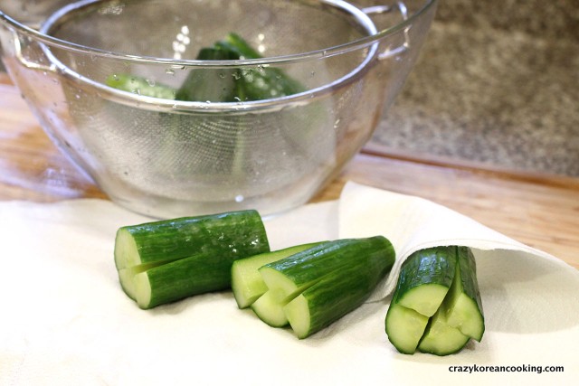 Rinse the cucumbers in cold water and drain water in a strainer. Let it drain for at least 15 min or pat dry with paper towel.