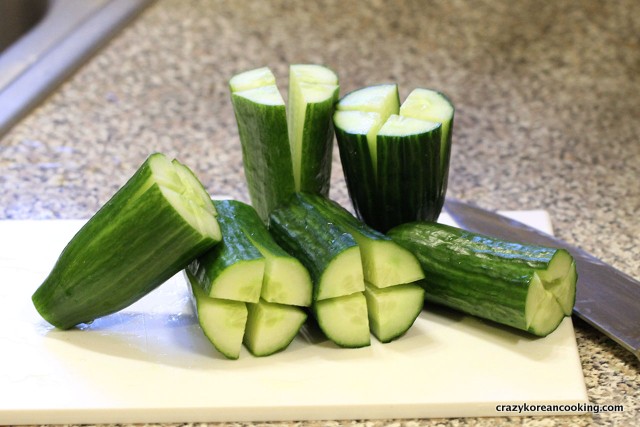 Slice off the ends of cucumbers. Cut cucumbers into 3” (7cm long pieces). Then, place the cucumber on end and cut in half down length without cutting through to the end (leave about ½” or 1.5 cm). Rotate the cucumber and repeat. The second cut should be perpendicular to the first cut (like a cross).