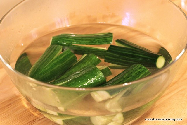 Instead of using brining solution, you can sprinkle about 2 tablespoons of coarse sea salt all over the cut cucumbers. Let it sit for 20 minutes (flip them after 10 min for the even distribution of salt). Rinse with cold water. Place the cucumber on a strainer (cut end facing down) to drain water out.