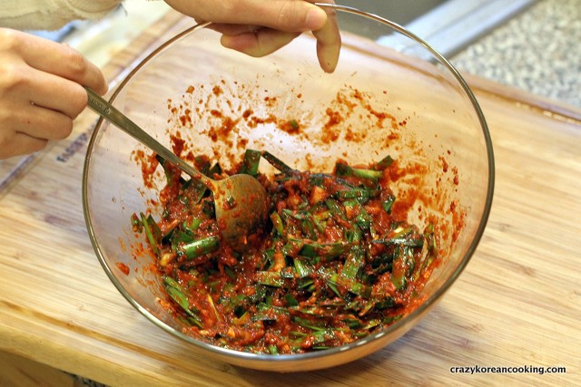 In a bowl, mix ⅓ cup of red chili flakes, 1 tablespoon of anchovy fish sauce, 1 tablespoons of shrimp fish sauce,1 tablespoon of minced garlic, 1 teaspoon of minced ginger, 1 tablespoon of sugar, ½ cup of water and cut up garlic chives.