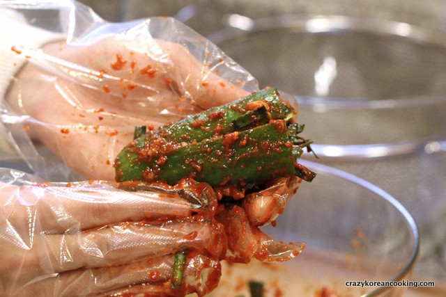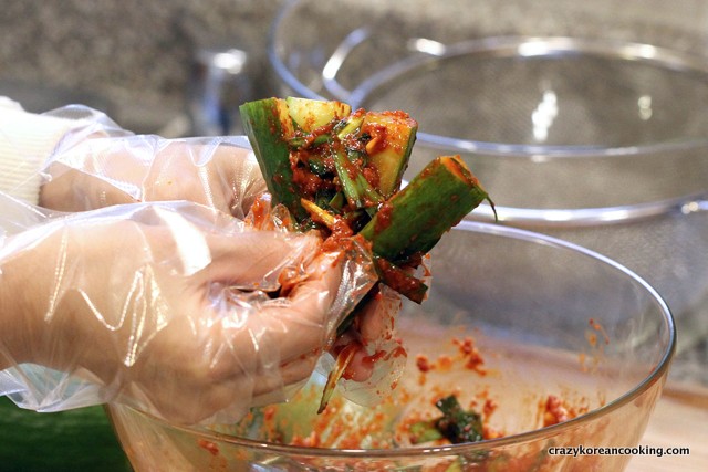 Stuff cucumbers with the seasoning. Make sure enough buchu (garlic chives) pieces are inside.