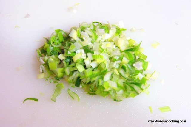2. Prepare garlic & green onions.Mince 3 cloves of garlic and chop a green onion. |