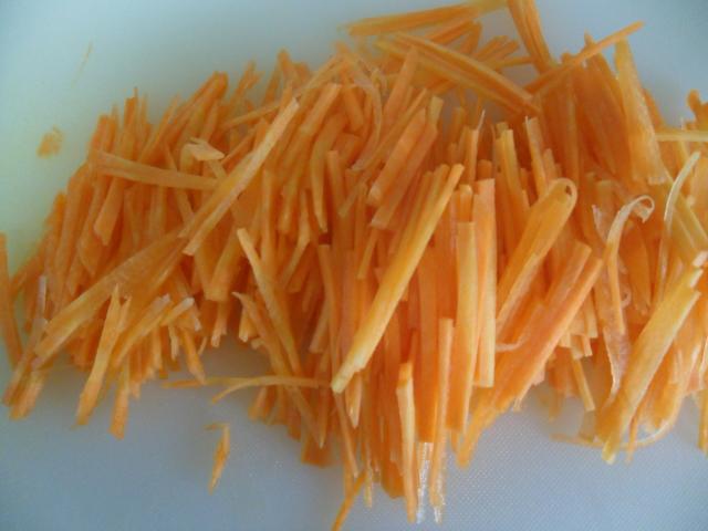 4. Julienne vegetables.Cut ½ onion, ¼ carrot and 4 perilla leaves (optional) into julienne strips. |