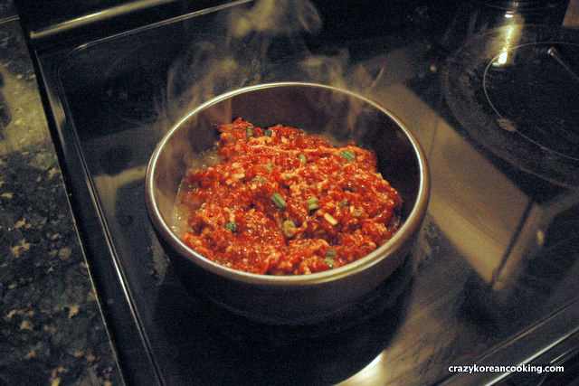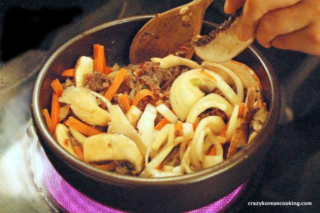 6. Cook beefPreheat 2-3 Korean stone bowls or hot pots (Dduk Bae Gi or Dol Sot) on low heat for 1-2 min. Then, add beef with all the marinade and cook on high heat for 3-5 min (or until it’s half cooked). You may need more stone bowls depending on how many servings you are making. You can make this dish in a regular pot and serve it on a plate. |